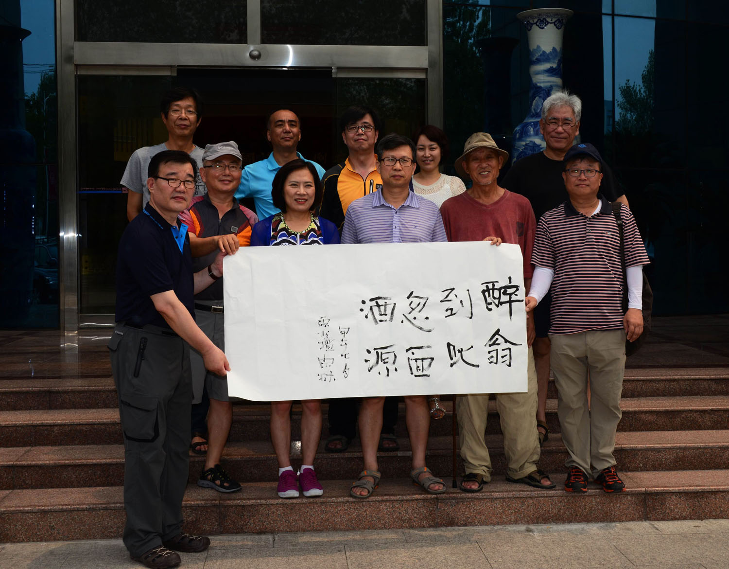韓國(guó)酒道家們先后參觀了齊魯酒文化博物館、中國(guó)醉書館、國(guó)井窖池群、國(guó)井井窖釀造坊、國(guó)井扳倒井遺址、中國(guó)白酒第一酒莊——國(guó)井1915酒莊、大世界基尼斯之最釀酒車間等。參觀期間,雙方就中韓兩國(guó)酒文化的起源、發(fā)展等內(nèi)容展開(kāi)了深入交流。韓國(guó)客人對(duì)酒祖故里文化倍加推崇,高麗大藏經(jīng)研究所理事長(zhǎng)宗林欣然書寫“酒翁到此忽面酒源”留念。